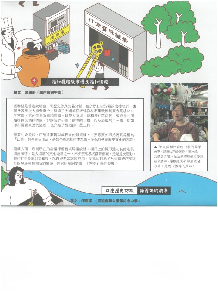 本校四位修讀高中中國歷史科的同學(6A吳梓浩、6B潘宇杰、6B譚朗軒、6C李奕藍)於2024-2025學年參與由「香港文化古蹟資源中心」舉辦的「文化遺產大使培訓計劃」。計劃內容包括「介紹深水埗社區歷史及何謂口述歷史」、「親身體驗口述歷史訪談,並分組擬定導賞路線及細節」及「社區導賞實習」。