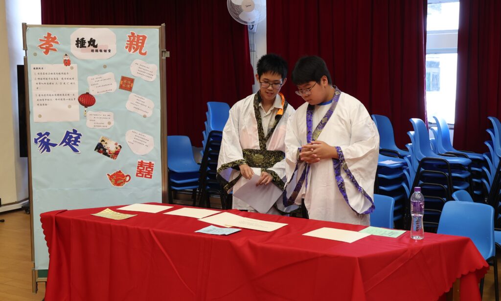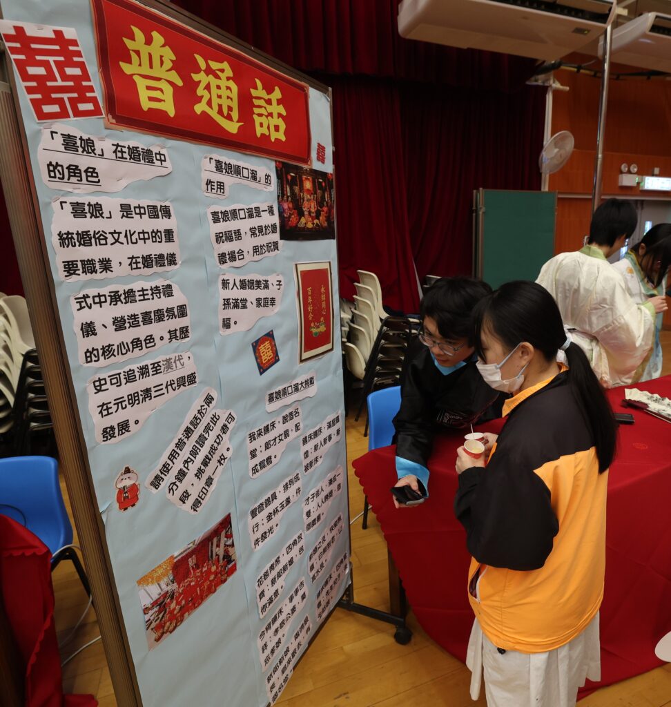 為了提升同學對中華文化的興趣,本校中文科、中史科、公民科、公經社科、歷史科、普通話科及國民教育委員會於11月3日至11月7日合辦了「文明中華之中國傳統婚嫁」主題周。活動期間,同學們透過參與包括「三書六禮」射箭、迎親敬祖堂(捶丸)、真愛「冚棉胎」(公民科、公經社科)、喜娘順口(普通話科)、AI繪夢婚嫁、AR賞影·趣拍、心意傳承(國民教育委員會)等豐富多元的攤位活動,以及彩虹祝福扇、情定剪紙等工藝體驗,深入了解中國傳統婚嫁的特色及意義。