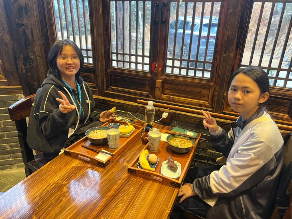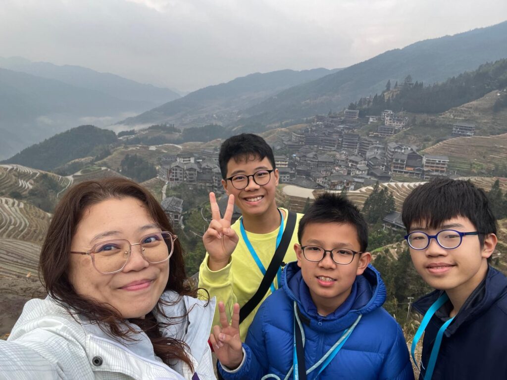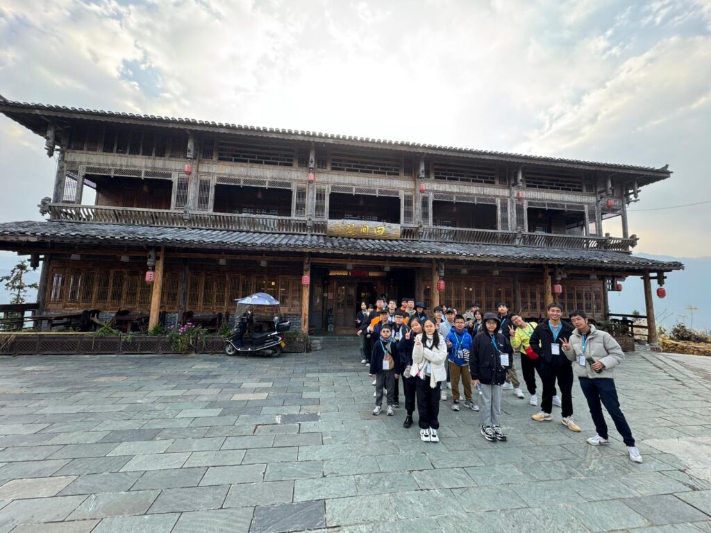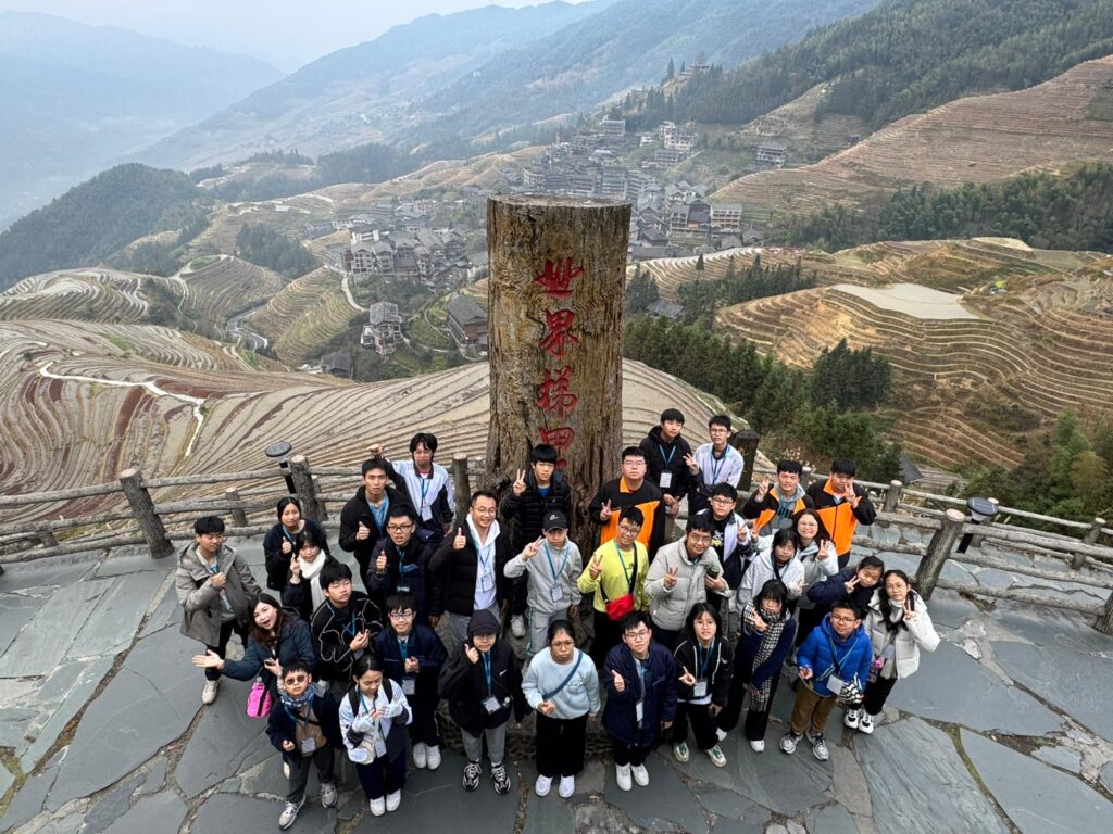 第二天:師生一同登上位於桂林市龍勝縣龍脊鎮的梯田。當地梯田歷史已有650多年,海拔最高達1100米,坡度最大可達50度。由於山脈形似龍的脊梁,因此得名「龍脊」;當地亦有俗話:「山是龍的脊,田是雲中梯」。