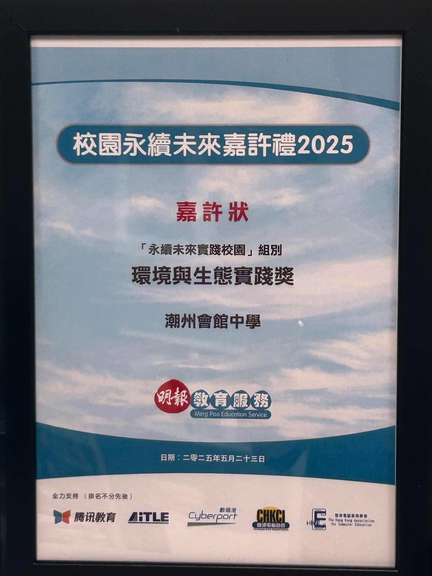 為加強學生對氣候變化的認識,2022-2023學年本校很榮幸邀請到香港中文大學農業生物技術國家重點實驗室主任林漢明教授的團隊到校,指導學生進行「潮中大豆跨科協作活動」。中三級學生參與「大豆STEAM科研獎勵計劃」,當中「潮中大豆科研大使」帶領班內學生完成大豆種植及科研任務。學校更以「大豆科研獎勵計劃」獲環境運動委員會頒發「2023最佳環境教育方案大奬」。