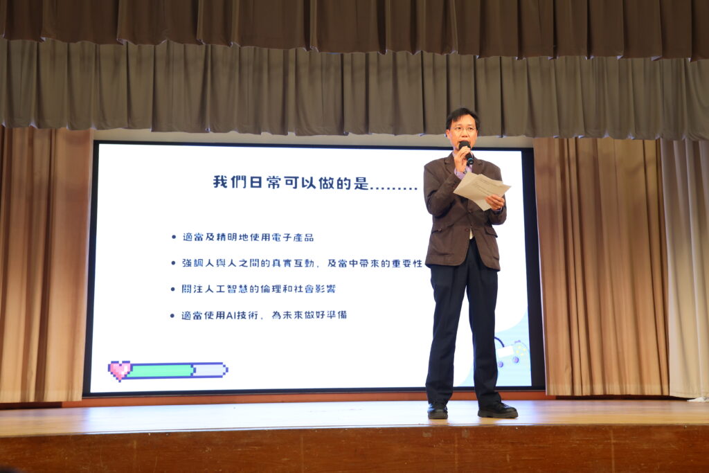 潮中全體師生於21/1齊集禮堂,參與由一微^_^米網上青年支援隊社工主講的資訊素養講座,講者分享網絡安全要訣,如何善用AI增值等等,為i世代好好裝備。